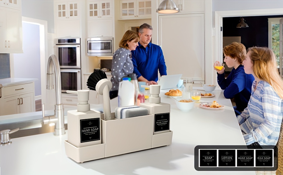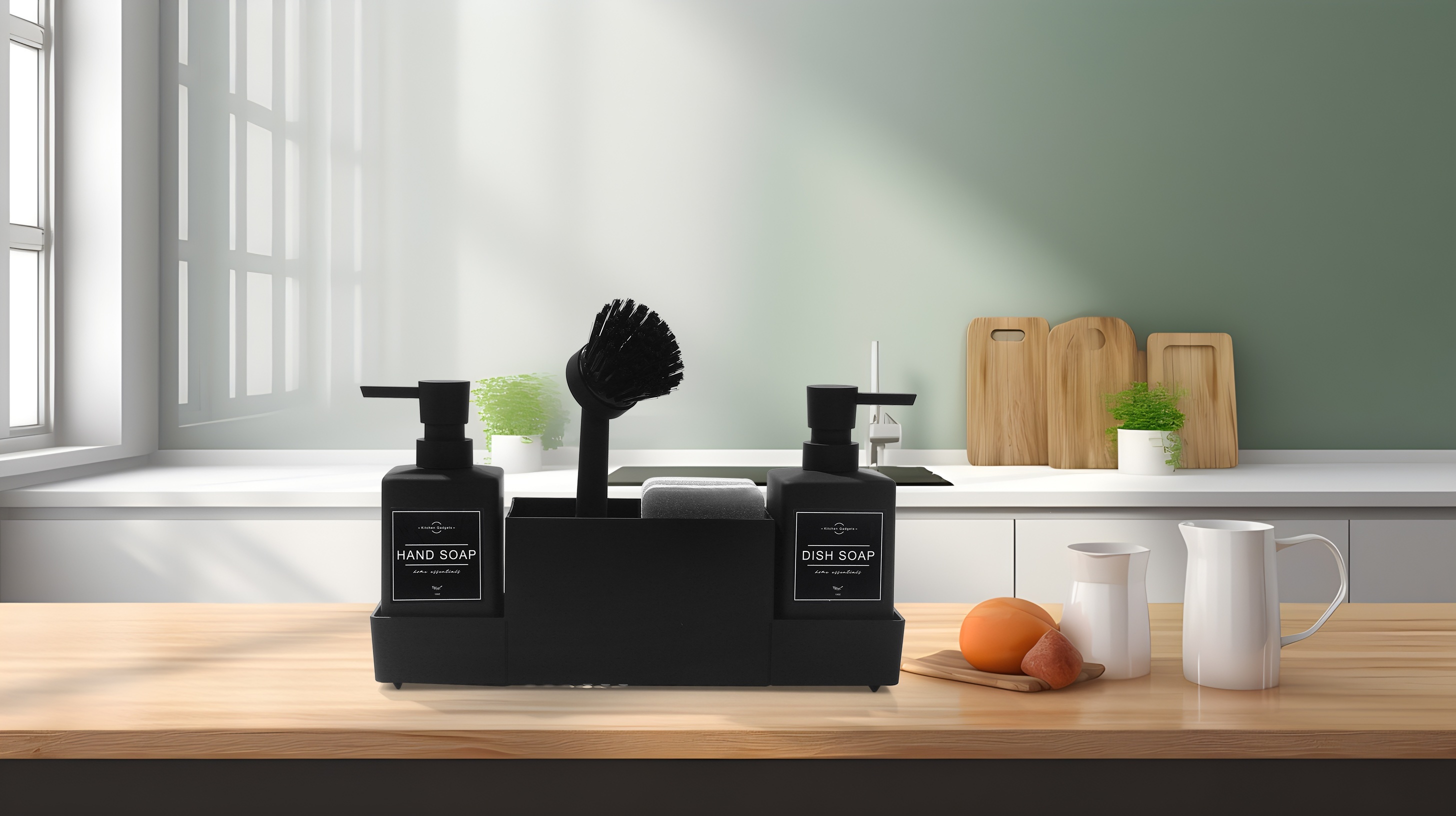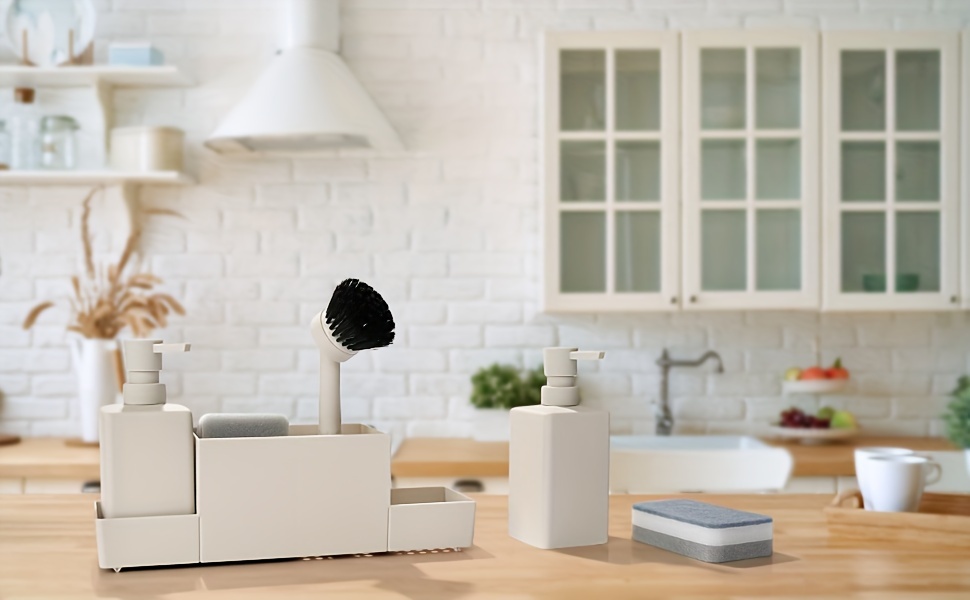 This multifunctional kit features two soap dispensers, a sponge rack, and a dish scrubber, enhancing the efficiency and orderliness of dishwashing. Eliminate mess and relish a neat kitchen with this comprehensive solution!