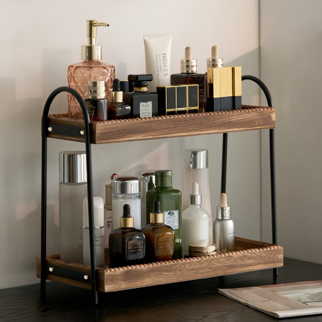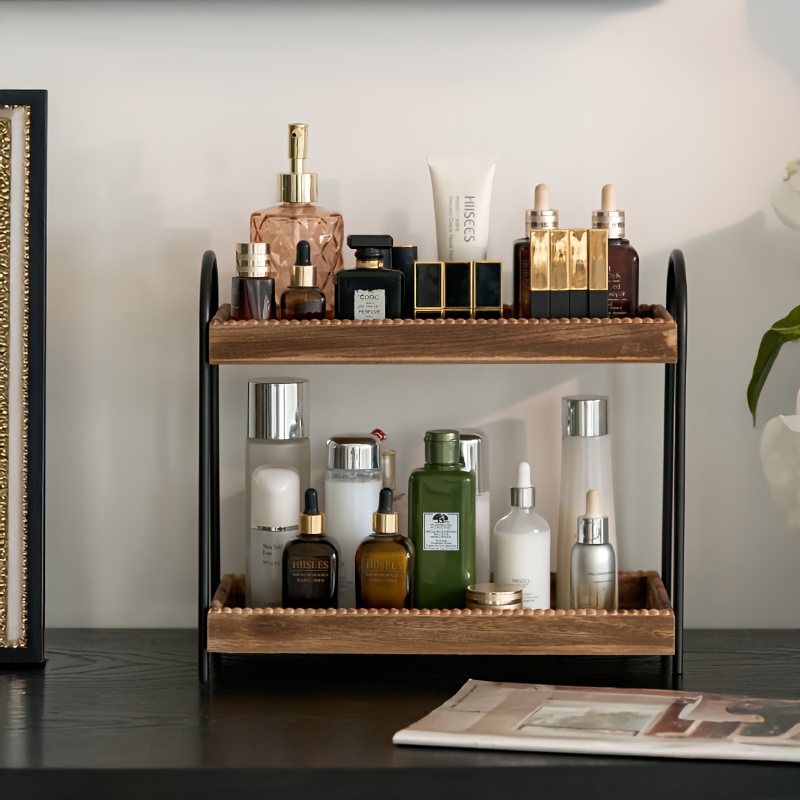 1pc Portable Countertop Makeup Vanity Shelf with Polished Finish, Compact Bathroom Storage for Skincare, Perfumes & Beauty Tools, No Assembly Needed, Makeup Vanity Desk, Elegant Design, Woven Texture, Durable Co