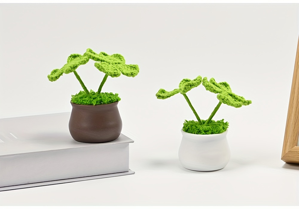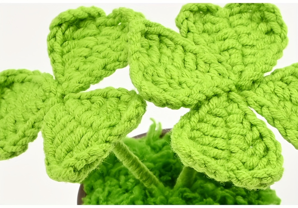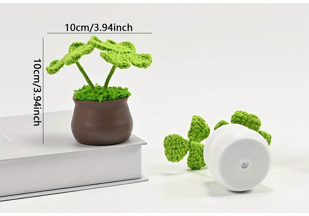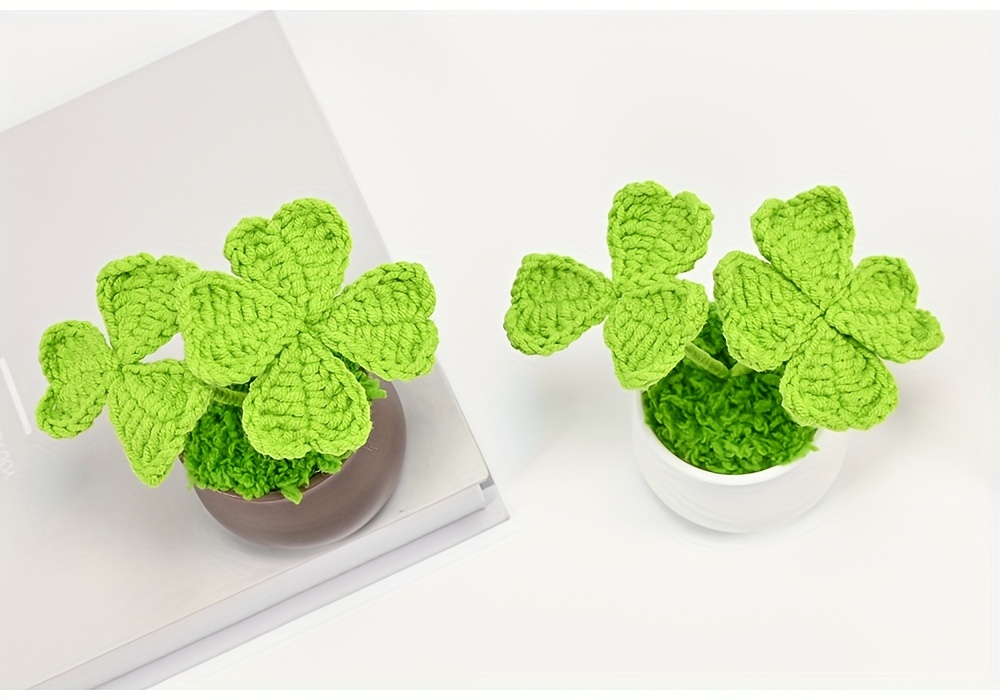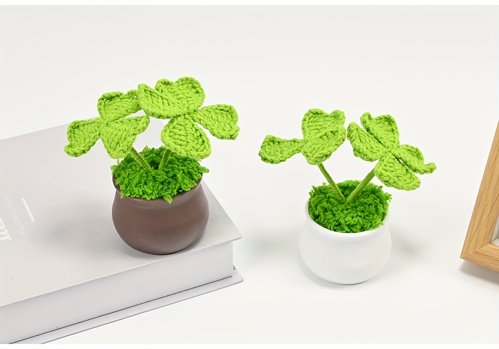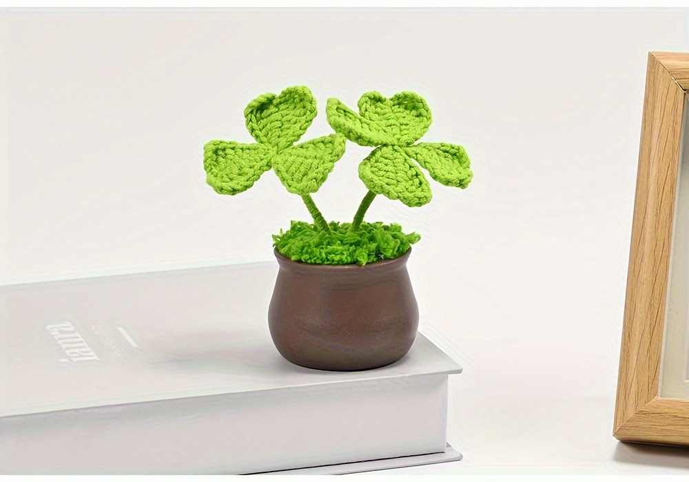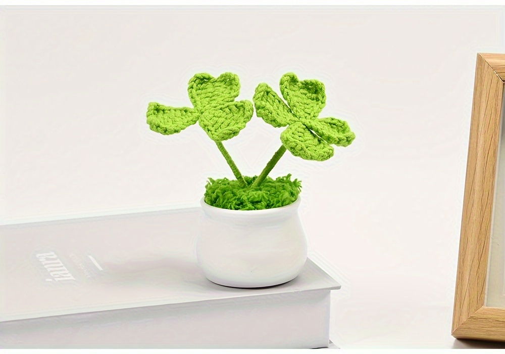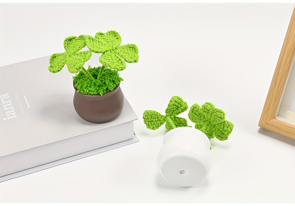 1pc Handmade Artificial Plant Potted, Crocheted Four-leaf Lucky Grass, Unique Knitting Home and Office Desktop Decoration