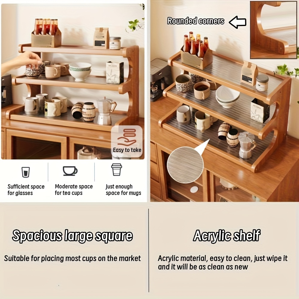 The open storage design of this multi-tier rack provides ample room for organizing and showcasing kitchen necessities, pantry goods, or home decor. Its open structure allows for convenient access to all your items while maintaining a tidy environment. The thoughtful design includes smooth acrylic shelves that are simple to clean and care for. The protective borders on each side keep your belongings safe, and the rounded edges enhance safety for your loved ones.